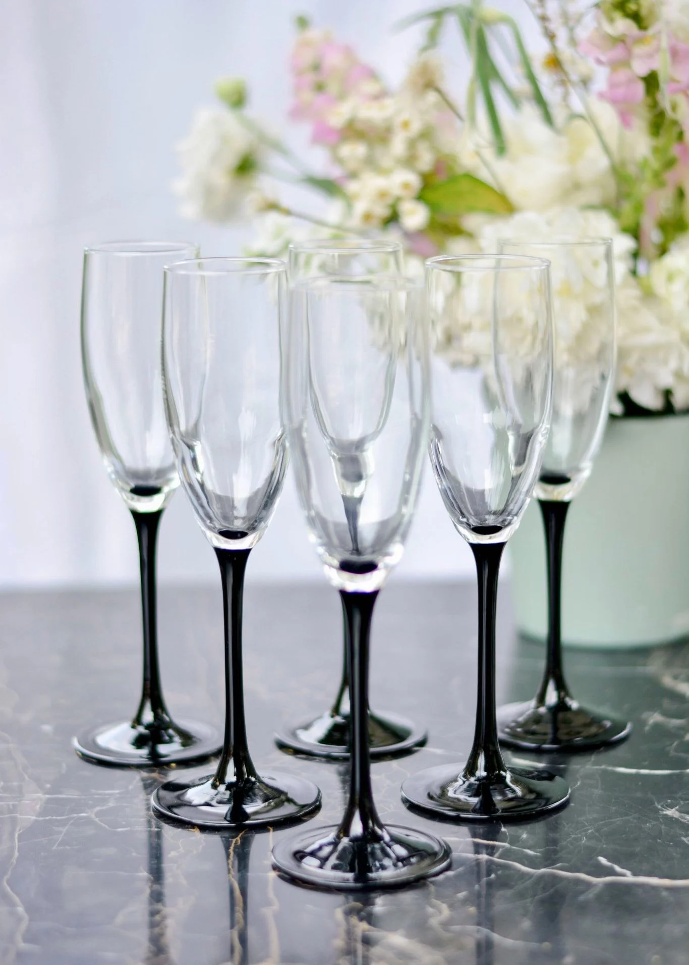 Cheer in style with these timeless black-stem champagne flutes. A classy and elegant choice for a black tie event, holiday soirée, bridal shower, glamorous wedding, or any dazzling celebration.